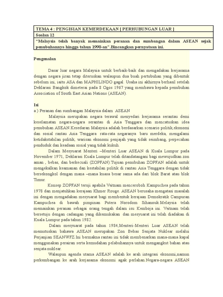 Penyertaan malaysia dalam asean merupakan satu keutamaan dalam menentukan arah tuju dasar luar negara. Peranan dan sumbangan malaysia sebagai anggota asean • menandatangani deklerasi kuala lumpur pada november 1971. Membuka peluang kepada usahawan baru muncul. Indonesia memiliki peranan yang cukup penting di dalam perkembangan asean, dimana indonesia merupakan salah satu penentu arah perkembangan organisasi tersebut. Association of southeast asian nations (asean).
